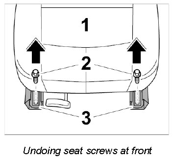 1. Move seat -1- to its rear limit position and undo the front fastening screws -2- from the right and left seat rails -3-.