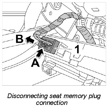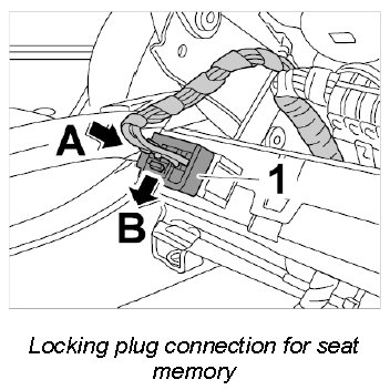 1. Release electrical plug connection -1- by activating the locking tab -arrow A- and remove from seat memory control module -arrow B-.