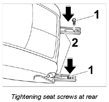 1. Move seat to its front limit position and undo the fastening screws -1- from the right and left seat rails -2-.