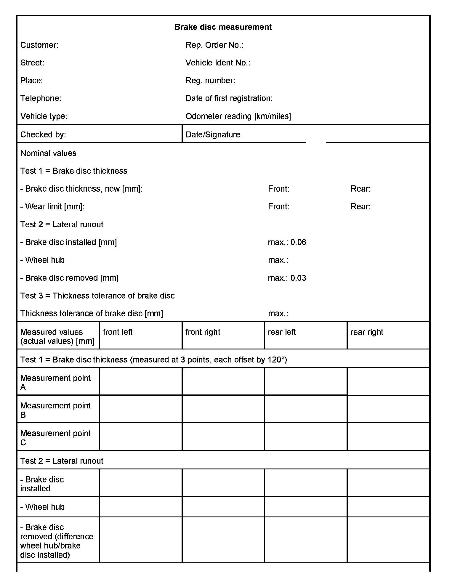 WM 460000 Brake disc measurement sheetInformation