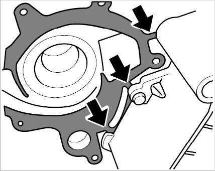 4. Position coolant pump with new seal on crankcase using two screws, note position of dowel sleeves.