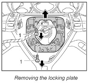 1. Unscrew the four fastening screws -1- from the locking plate in the steering wheel and remove along with the locking plate.