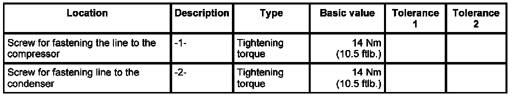 2. Insert compressor-condenser line into the line to the compressor and fasten with the fastening screw -2-. - Tightening torque: 14 Nm (10.5 ftlb.)