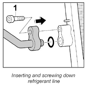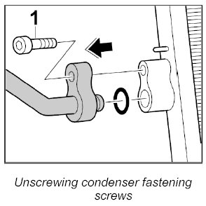 1. Unscrew the fastening screw -1- for the condenser line and pull the line out of the condenser.