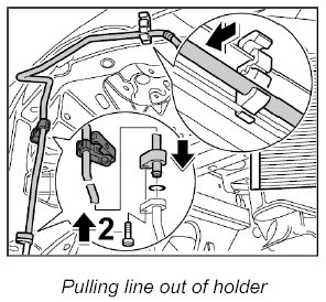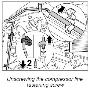 3. Unscrew the fastening screw -2- for the line to the compressor and pull the line out of the compressor line.