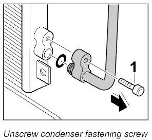 4. Unscrew the fastening screws -1- of the line condenser-condenser and pull the line out of both condensers.