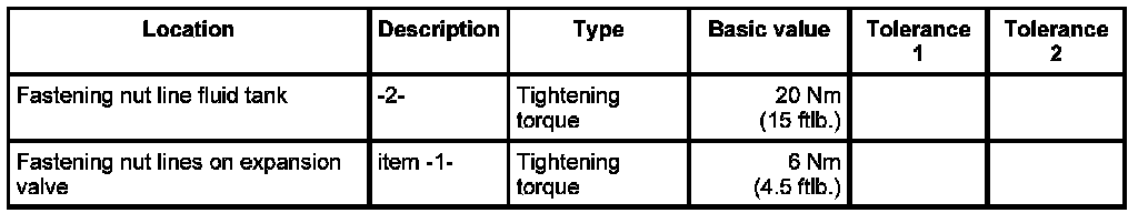 1. Lay the refrigerant line under the heat exchanger hoses and screw down on line to fluid tank -2- with fastening nut. - Tightening torque: 20 Nm (15 ftlb.)