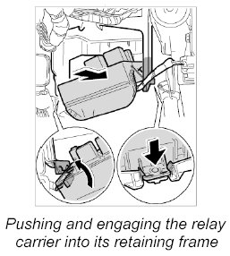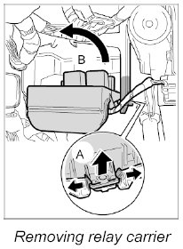 1. -A- Pull apart both retaining lugs on relay carrier support and press the relay carrier upward.