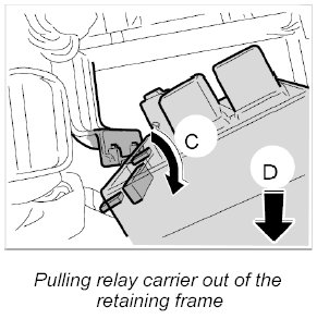 3. -C- Pull out the support lugs of the relay carrier from the support and -D- pull out the relay carrier downward.