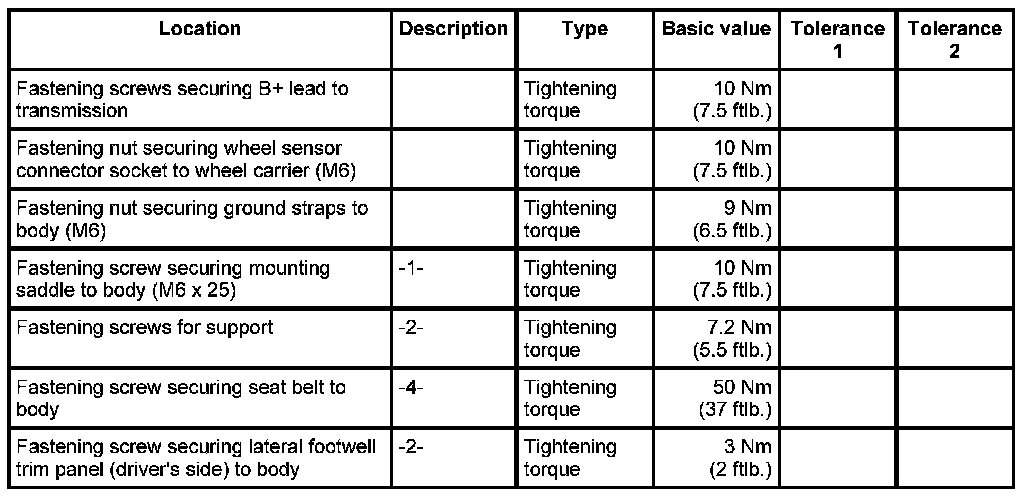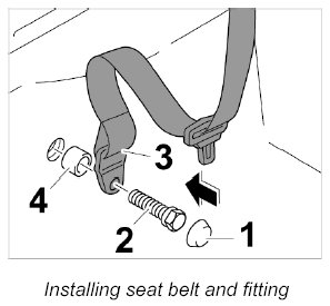 5.1. Screw in fastening screw -2- , seat belt and fitting -3- and spacer sleeve -4- on inner lower side member. - Tightening torque: 50 Nm (37 ftlb.)