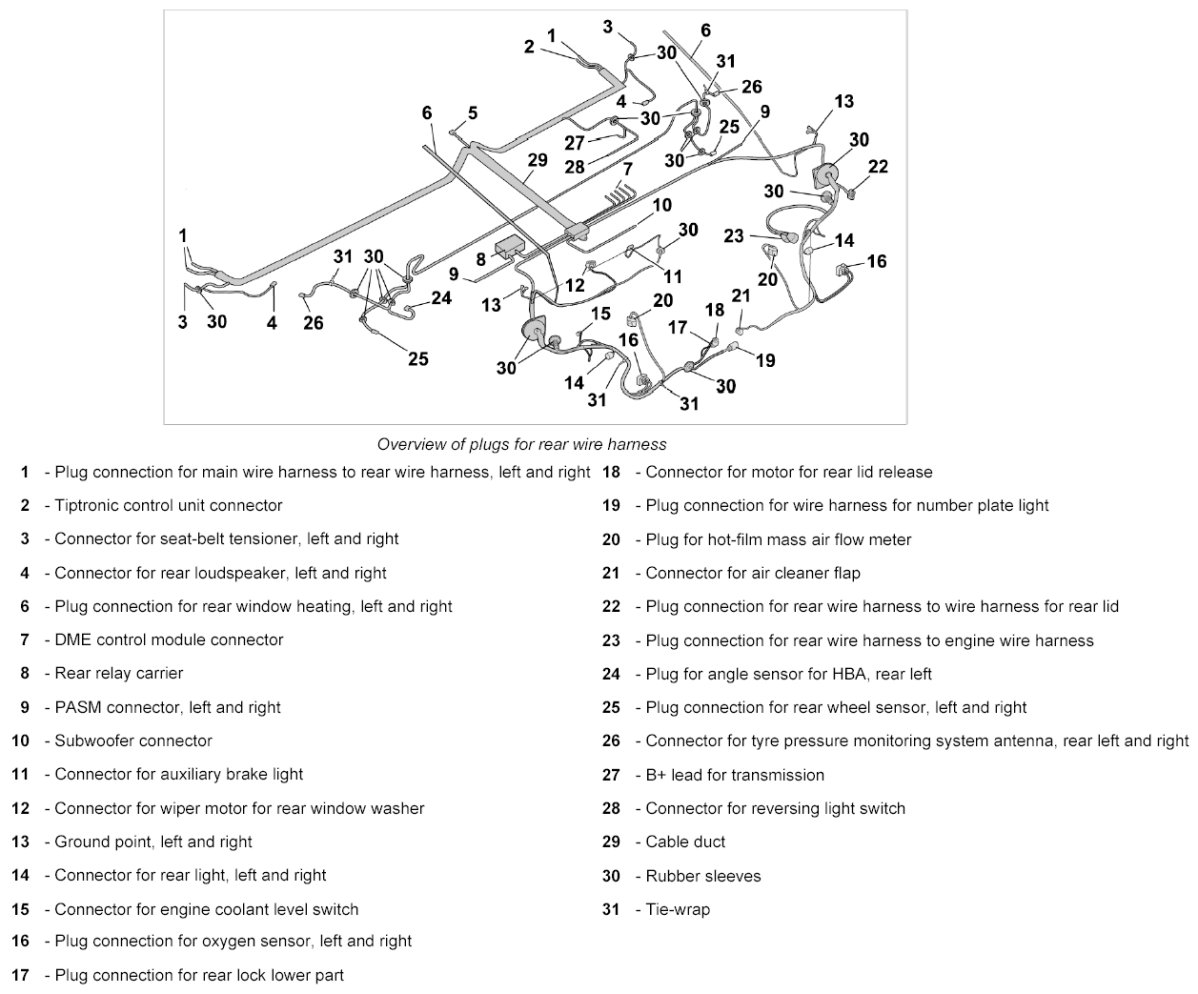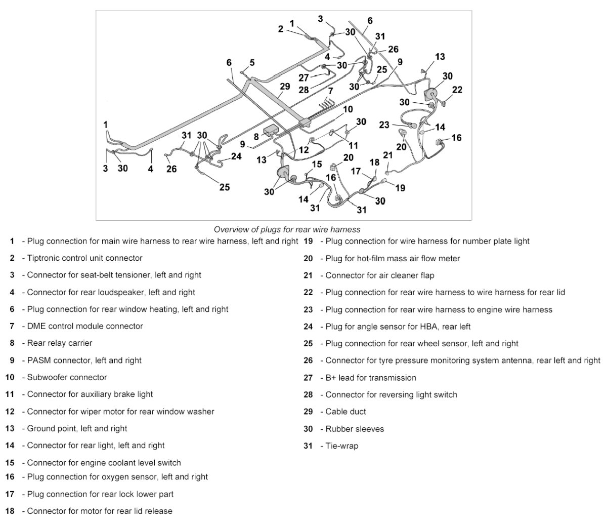 15. Release and disconnect plug connection for rear wire harness to wire harness for rear lid -22-.