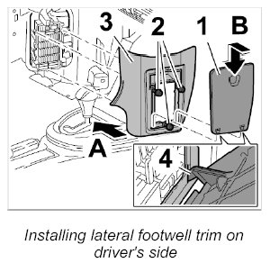 2.2. Unscrew both plastic nuts -2- and take off the footwell trim panel -3- ( -arrow B- ).