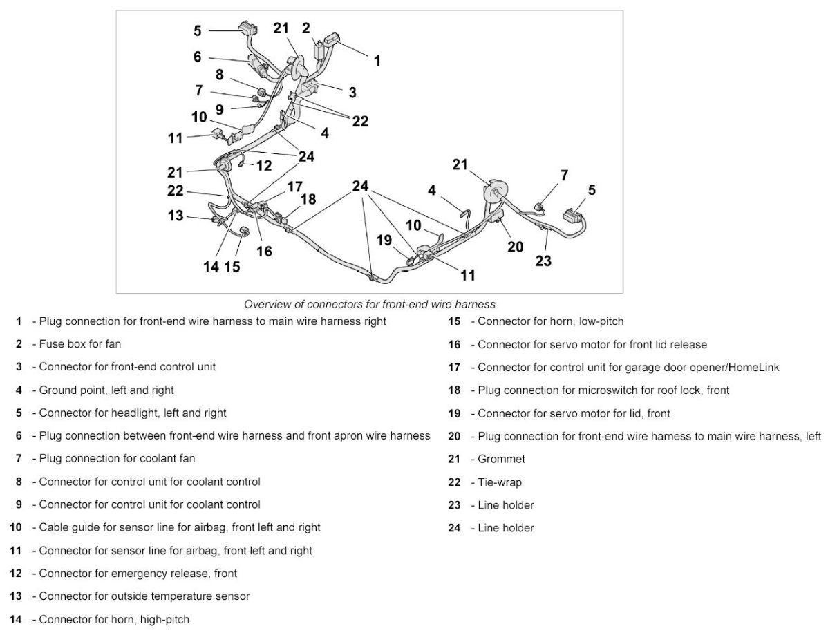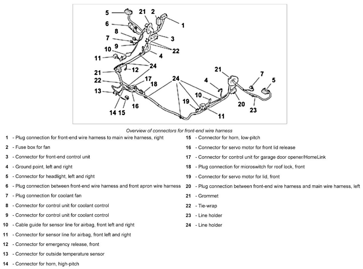 - The wire harness for front end spare parts scope means the scope for fully-equipped vehicles. Depending on the vehicle equipment, connectors not required are tied to the wire harness for front end using tie-wraps.