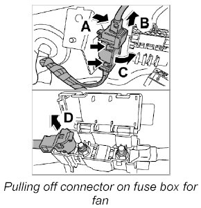 2.3. Pull off connector on fuse box for fan -arrow D-.