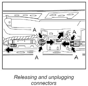1. Release electric connectors for the equipment versions (e.g. cigarette lighter, interior sensor etc. -A- and unplug.