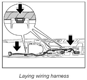 1. Lay wiring harness with retaining clips in centre console and push on retaining clips at the points provided.