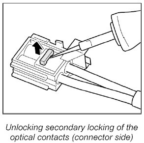 3. Position the press-out and unlocking tools for flat-type and round plug connectors of all sizes NR.155 for releasing the contact locking mechanism of the optical waveguide module and lift up the locking mechanism.