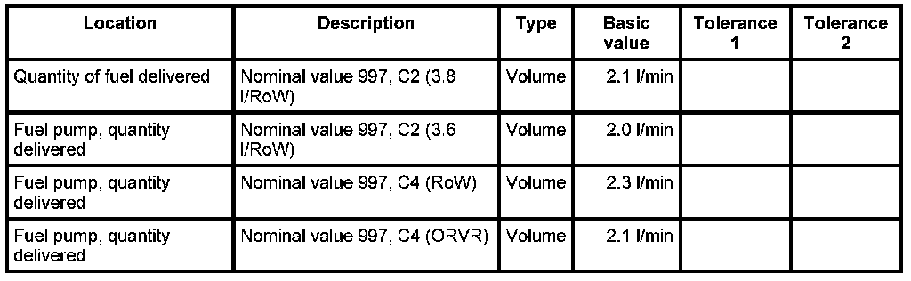 12. Pour the collected fuel into the measuring cup and compare the quantity with the vehicle-specific nominal values listed below. - Volume: 2.1 l/min. - Volume: 2.0 l/min. - Volume: 2.3 l/min. - Volume: 2.1 l/min