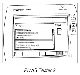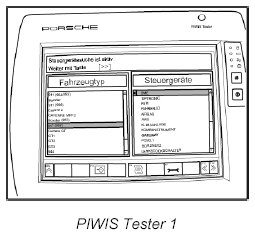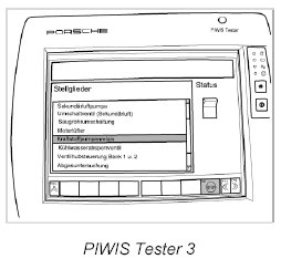 3. Connect the Porsche PIWIS Tester PIWIS Tester 9718 to the input socket in the vehicle using the adapter lead, switch on the ignition and switch off all loads, such as the radio and air conditioning. Switch on the Tester and select the vehicle (option: Diagnostics).