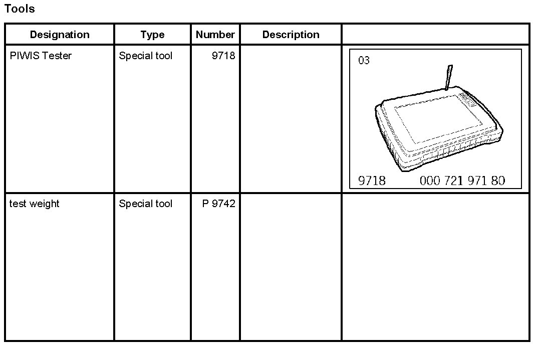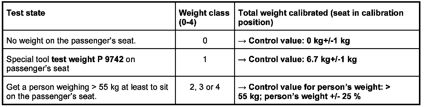 11.1.2. Place the special tool test weight P 9742 on the passenger's seat. The Passenger Airbag Off indicator light in the centre console must come on. Compare values (see table below) using the PIWIS Tester.