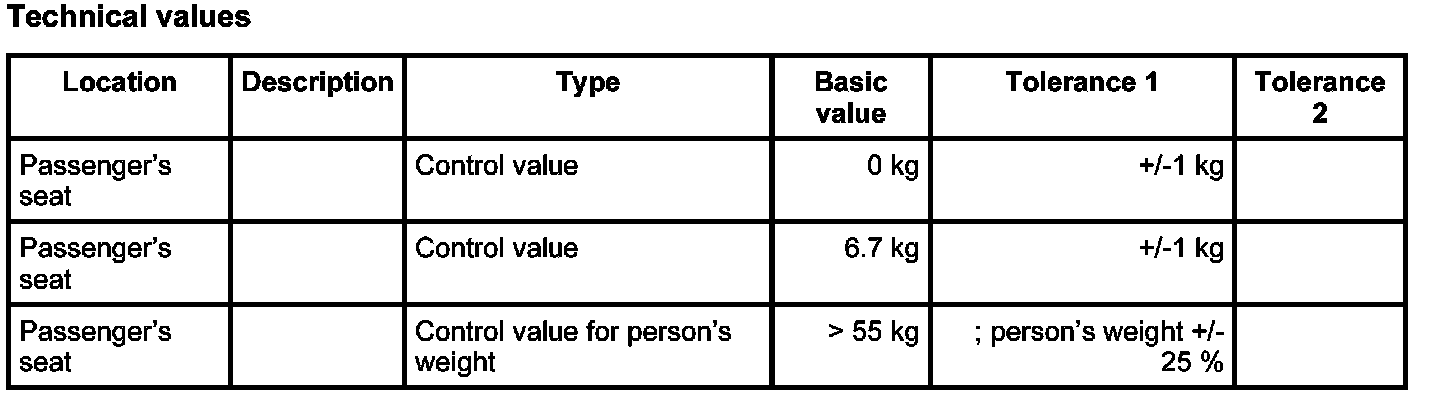 11.1.1. If there is no weight on the passenger's seat, compare values (see table below) using the PIWIS Tester. The Passenger Airbag Off indicator light in the centre console must not come on.