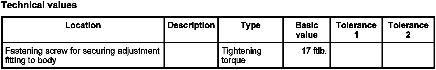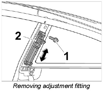 1. Run adjustment fitting -2- down into the B-pillar -direction of arrow- and tighten the fastening screw -1-. Tightening torque: 17 ftlb.