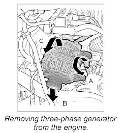 3. Lift the right generator over the bracket on the engine -A-, then pull forwards and down -B- and raise clear of the engine from the rear -C-.