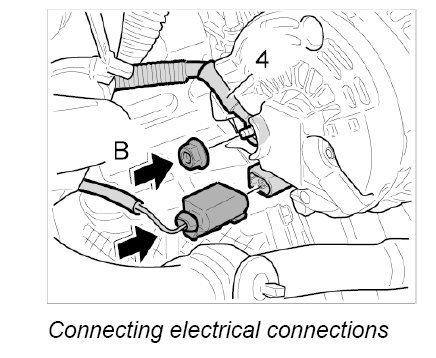 1. Position the generator on the engine, fit the B+ line -4- and secure with the fastening nut -B-. - Tightening torque: 18 Nm (13 ftlb.)