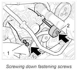 5. Secure the generator with the two fastening screws -1, 2-. - Tightening torque: 46 Nm (34 ftlb.) - Tightening torque: 46 Nm (34 ftlb.)