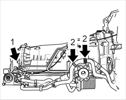 2. Unclip coolant lines from holders -2- on transmission.