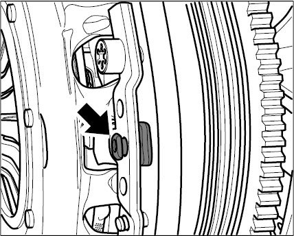 When loosening the clutch pressure plate, ensure that the stop on the adjustment mechanism -arrow- is detached from the housing. The stop must dip loosely into the housing as far as the block. Press the stop towards the flywheel, if necessary.
