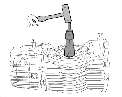 11.1. Drive the old outer bearing ring into the transmission housing using pressure piece 9708/6.