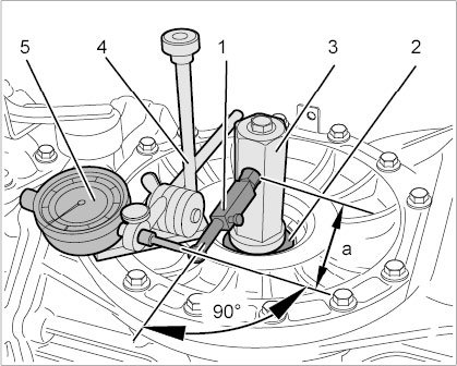 The average of the four measurements must be between 0.06 mm and 0.11 mm and must not deviate by more than 0.03 mm from the original tooth backlash. Furthermore, no individual measurement may deviate by more than 0.04 mm from the original tooth backlash. If one of the specified conditions is not met, the adjusting shim measurement must be recalculated. The tooth backlash must then be checked again. The total shim thickness SGesn must not be changed.