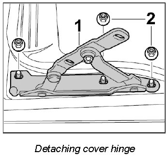 2.1. Loosen fastening nuts -2- slightly at the two cover hinges -1-.