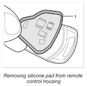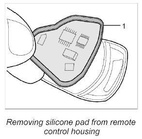 2. Remove silicone pad -1- with PCB from the remote control housing.