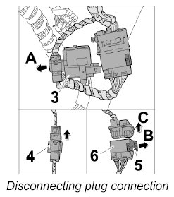 2. Release locking mechanism -5- on the wire harness plug connection for door -6- ( -arrow B- ) and disconnect it -arrow C-.