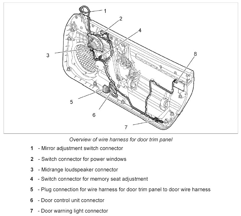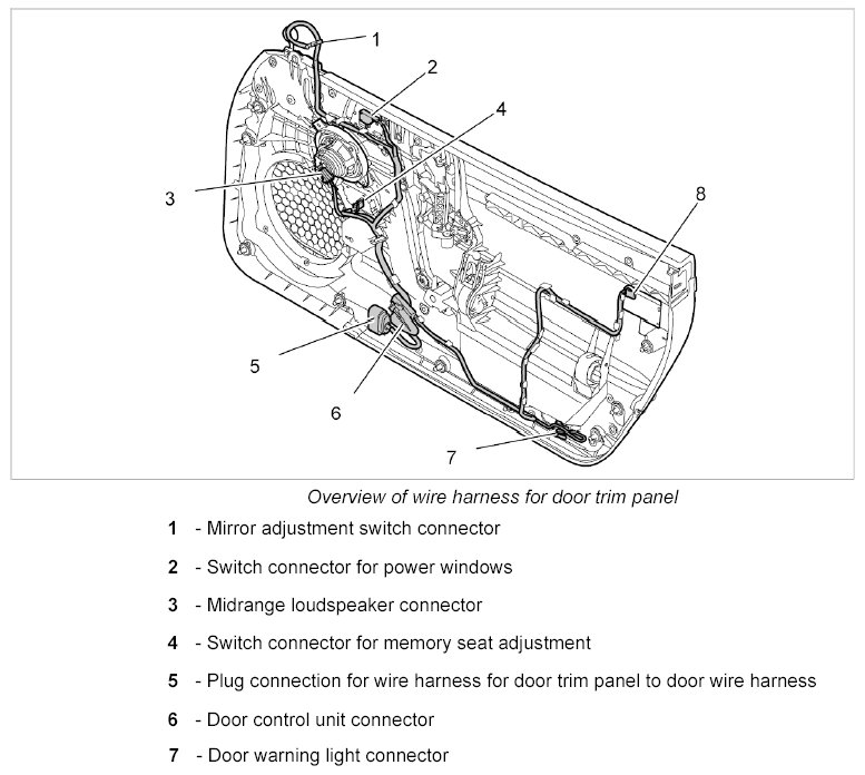 - The wire harness for door trim panel spare parts scope means the scope for fully-equipped vehicles. Depending on the vehicle equipment, connectors not required are tied to the wire harness for door trim panel using tie-wraps.