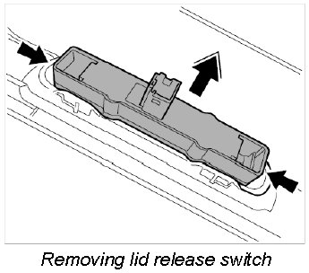 1. Press fastening ribs of scuff plate -arrows- outward with a small screwdriver and unclip switch for lid release.