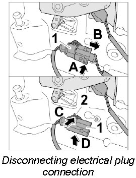 1. Separate electrical plug connection -1- for lid release by pressing the locking tab -Pfeil A- -Pfeil B-.