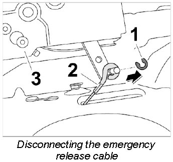 1. Press out circlip -1- and pull out emergency release cable -2- from lower part of lid lock -3-.
