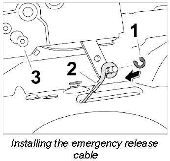1. Position emergency release cable -2- on lower part of lid lock at rear -3- and secure using circlip -1-.