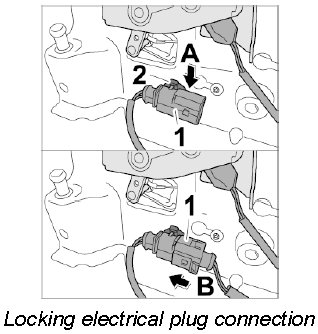 2. Lock electrical plug connection -1- for lid release until locking tab is felt to engage -Pfeil B-.
