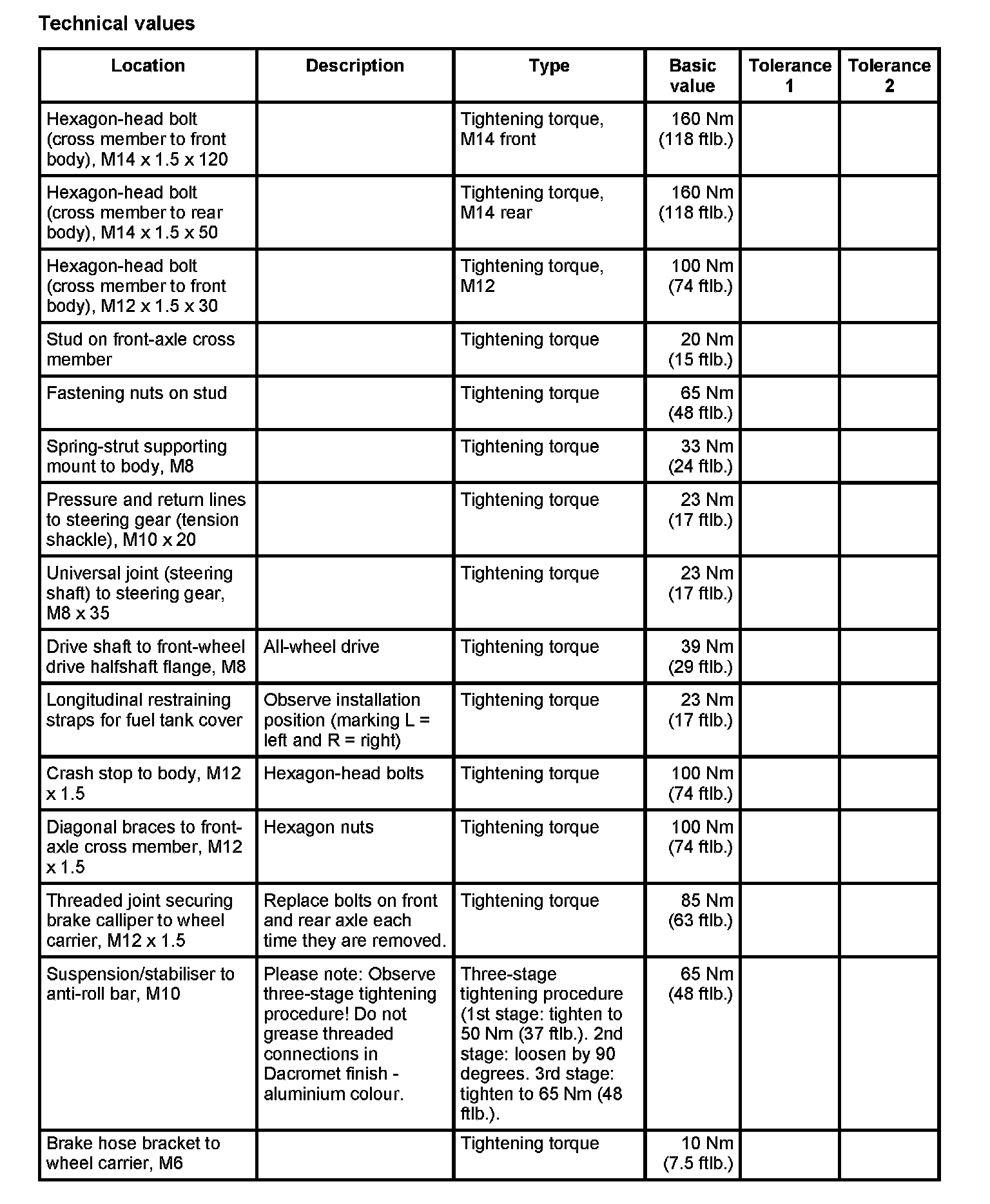 The front axle is removed complete with spring struts, wheel carriers, drive shafts (for all-wheel drive), steering gear and tie rods. Drain coolant and remove the brake caliper at the wheel carrier (brake hydraulic system not open).