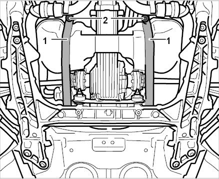 12.2. For all-wheel drive: Loosen and unscrew the nuts -2- on the transmission support -1-.