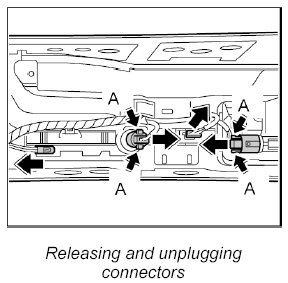 1. Release electric connectors for the equipment versions (e.g. cigarette lighter, interior sensor etc. -A- unplug.