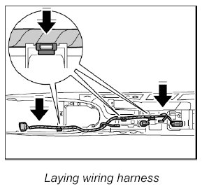1. Lay wiring harness with retaining clips in centre console and push on retaining clips at the points provided.