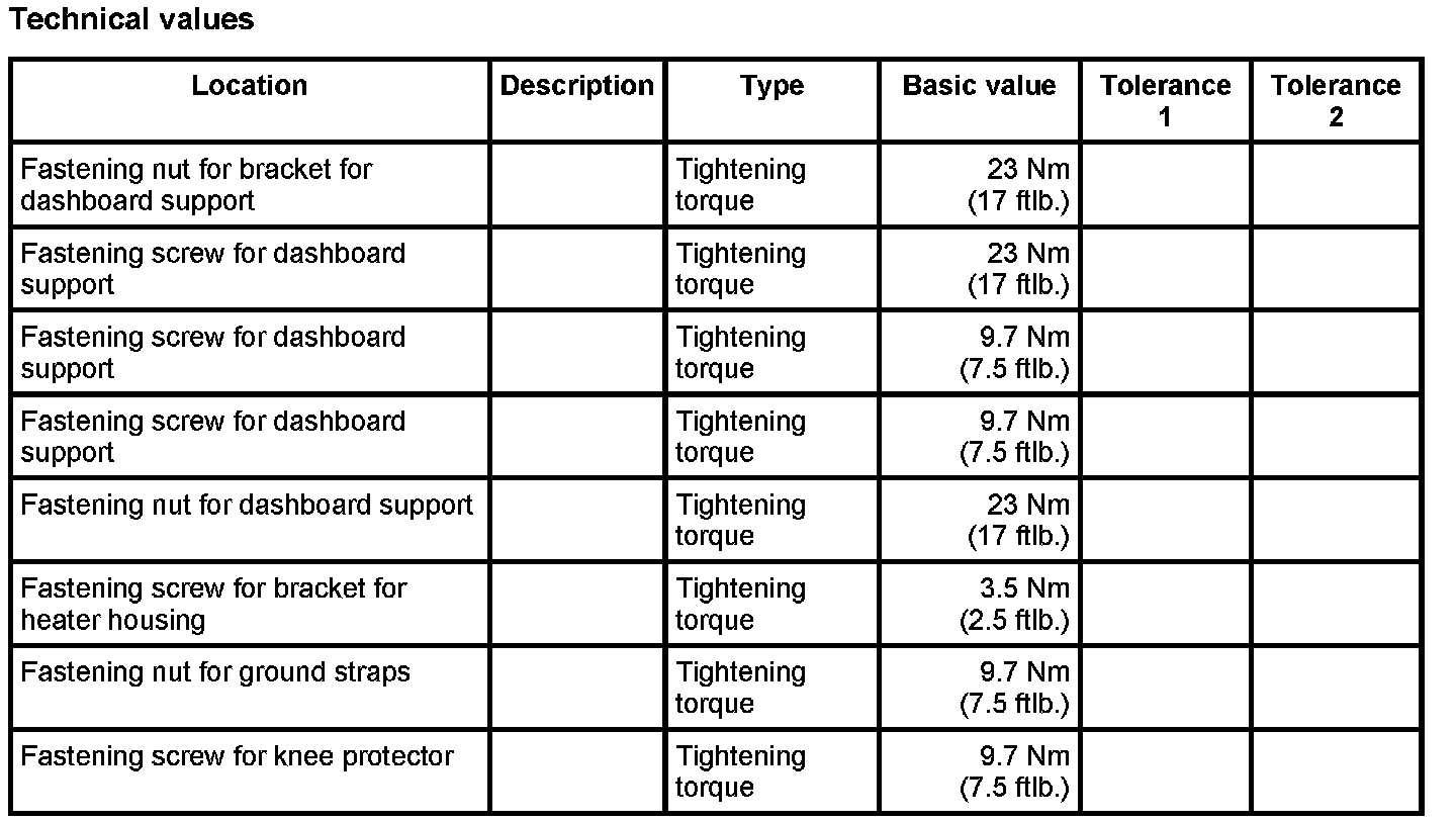 19. Position knee protector -2- on dashboard support and secure in place with fastening screws -1-. Tightening torque: 9.7 Nm (7.5 ftlb.)