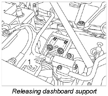 9. Unscrew right fastening screw -1- and pull dashboard support -3- out slightly.