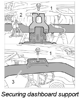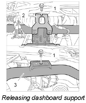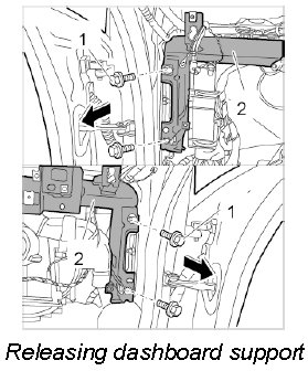 7. Unscrew fastening screws at the left and right -1- on the dashboard support -2-.