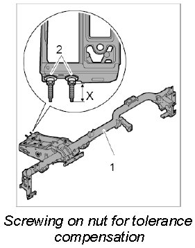 1. Screw on nut for tolerance compensation -2- on dashboard support -1- to the dimension -X= 35 mm-.
